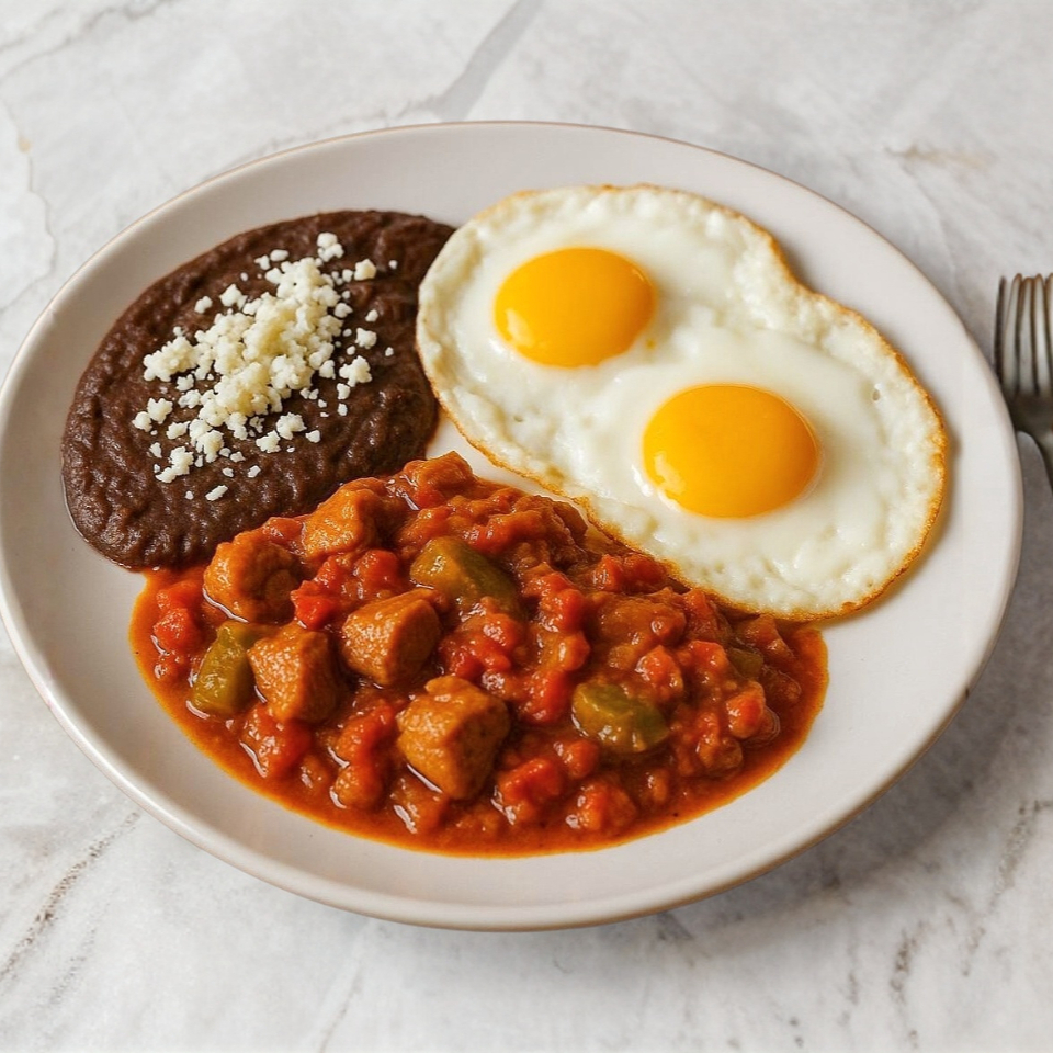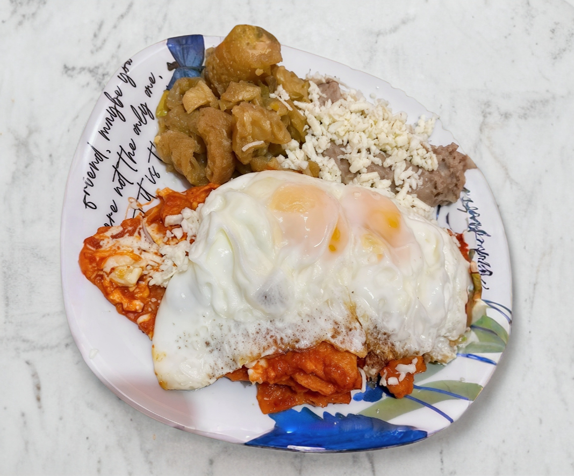 Chilaquiles con queso menonita, un guisado a elegir, dos huevos al gusto y frijoles con queso.