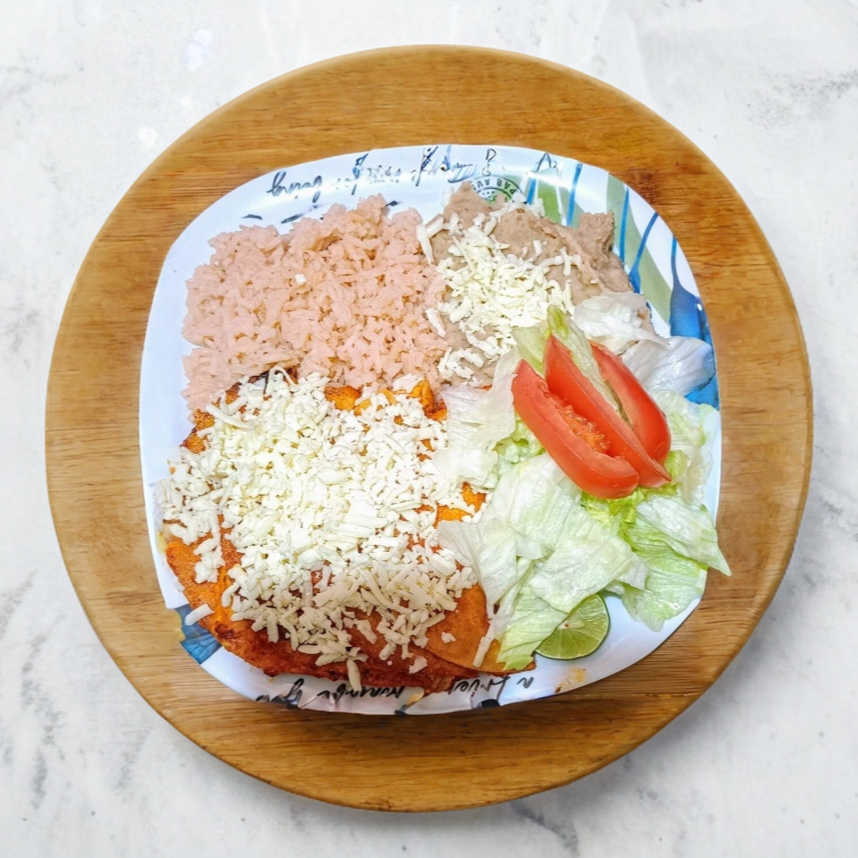 4 enchiladas rojas estilo kermes, verdura, arroz y frijoles con queso
