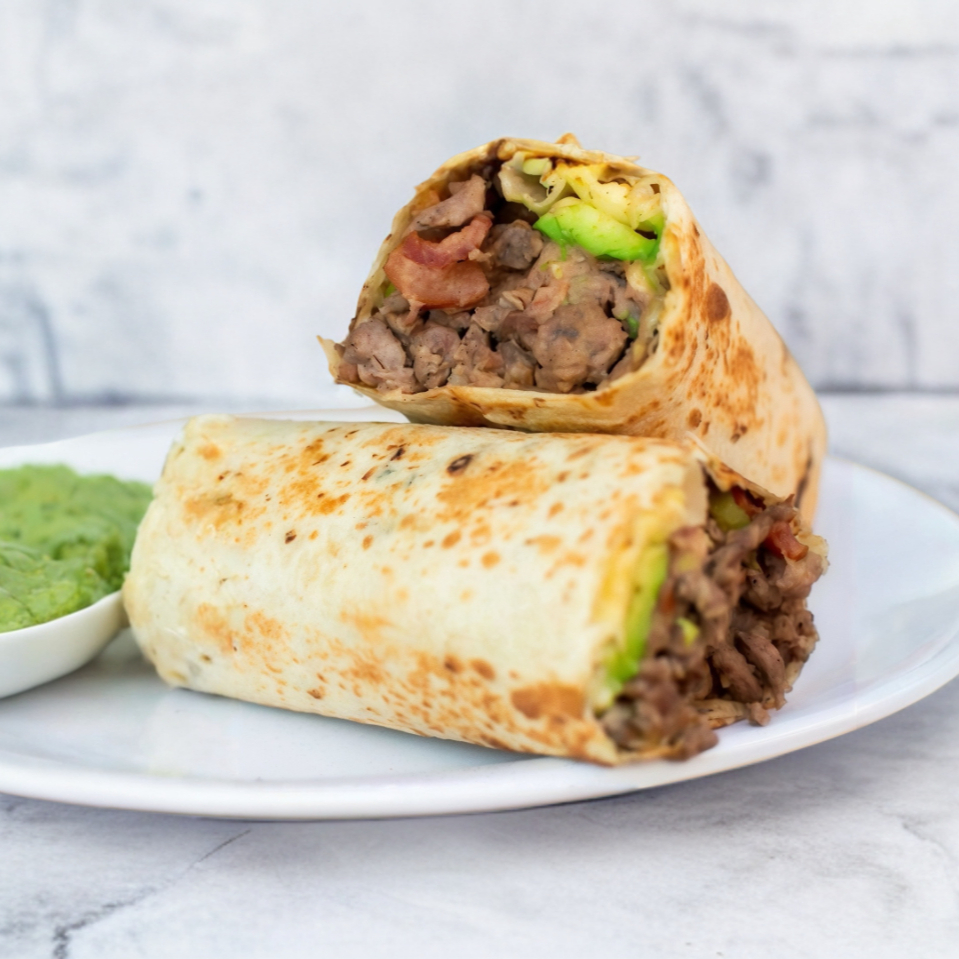 Burrito en tortilla de harina hecha a mano, con bistec (130 g en crudo), cebolla, chile jalapeño, queso menonita, aguacate y lechuga.