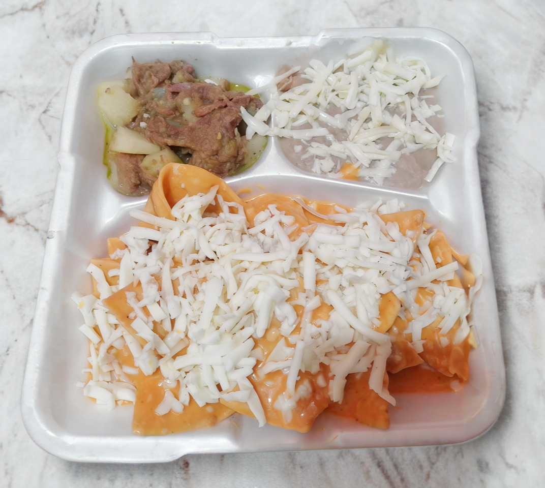Chilaquiles con queso,1 guisado a elegir, frijoles con queso