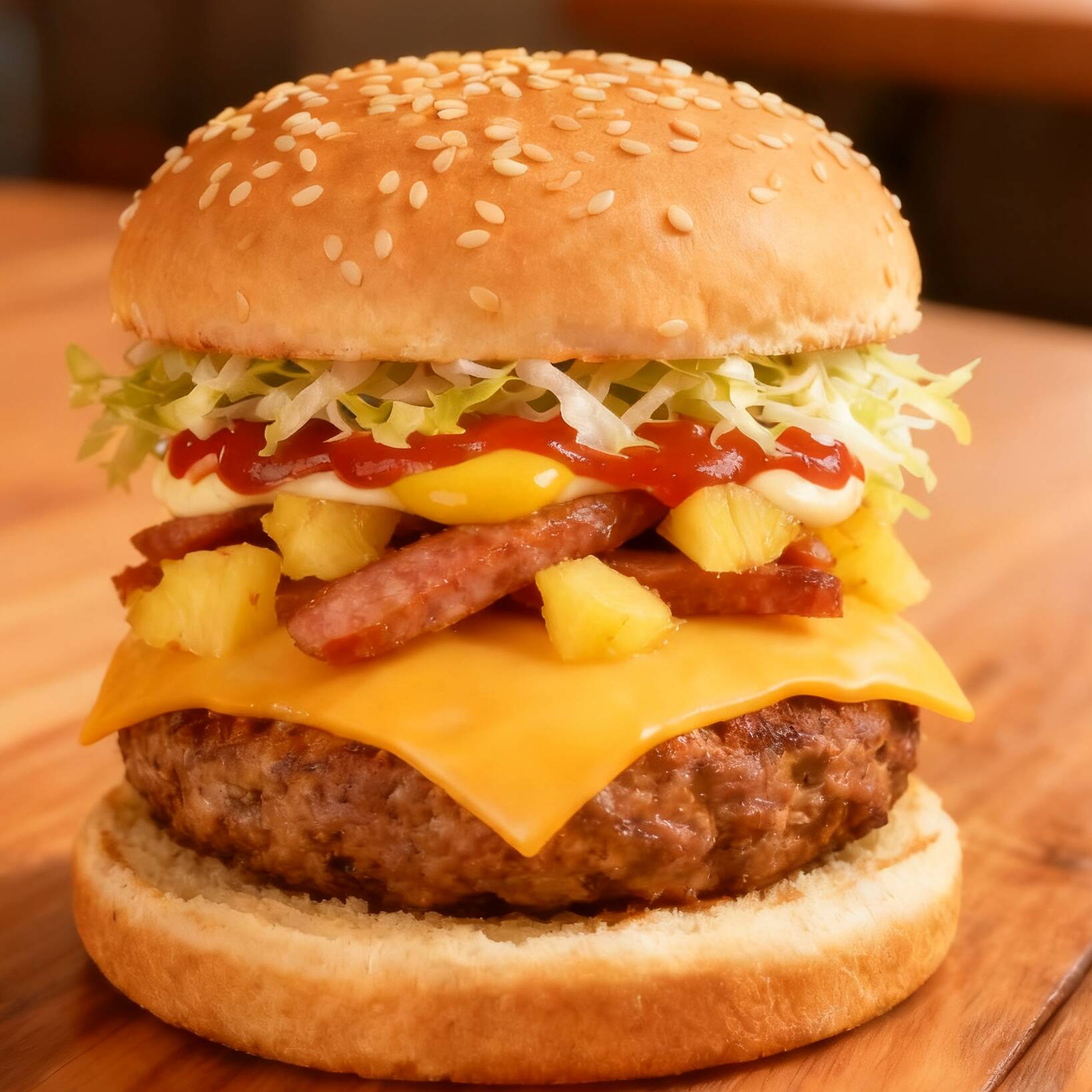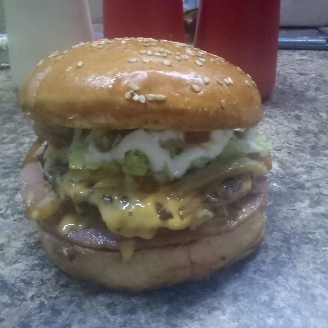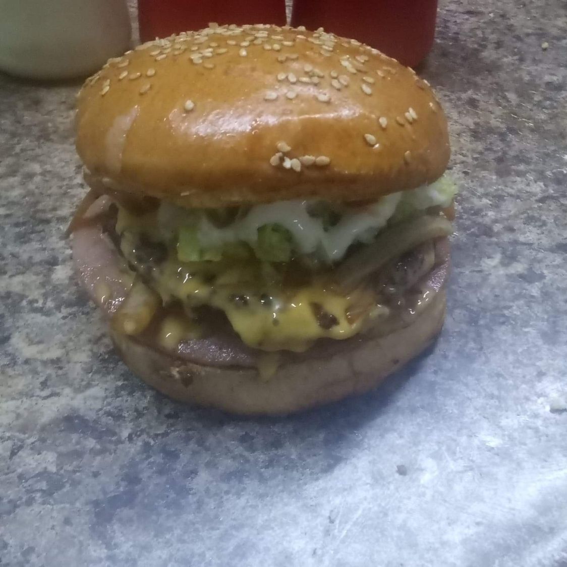 Pan brioche con ajonjolí carne 100% sirloin rebanada de jamon con trocitos cebolla y Winnie sazonado y bañada de queso amarillo lechuga aguacate tres líquidos pepinillos incluye salsa casera aparte