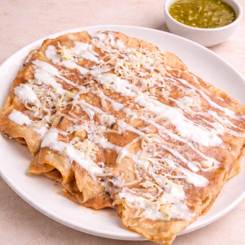 Orden de enfrijoladas con 3 tortillas echas a mano, (tortillas grandes) rellenas de queso, y preparadas con queso y crema y salsa aparte