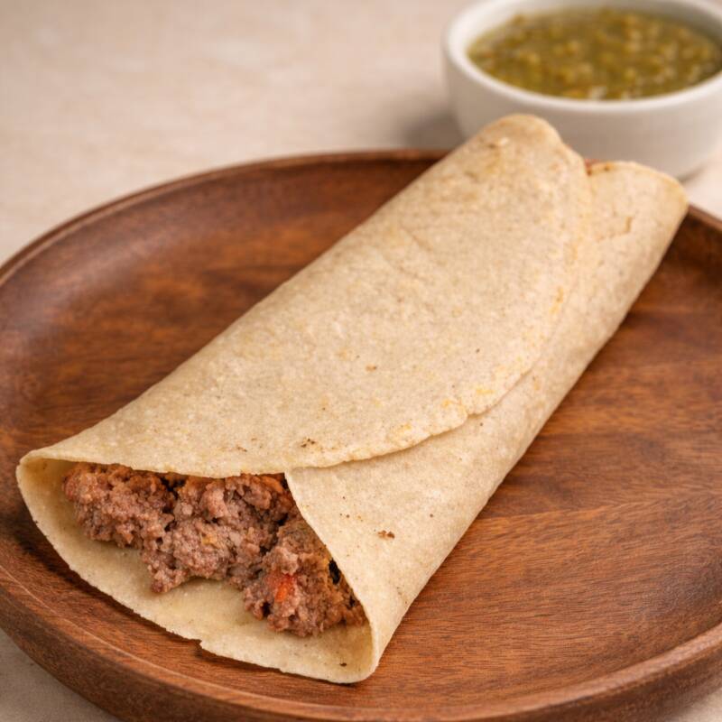 Tortilla de maiz hecha a mano estilo burrito con frijoles y guisado de picadillo ala mexicana, salsa aparte