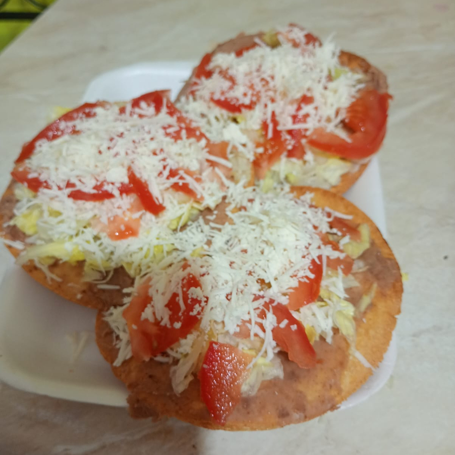 tostadas preparadas con frijol, lechuga, tomate, crema y queso