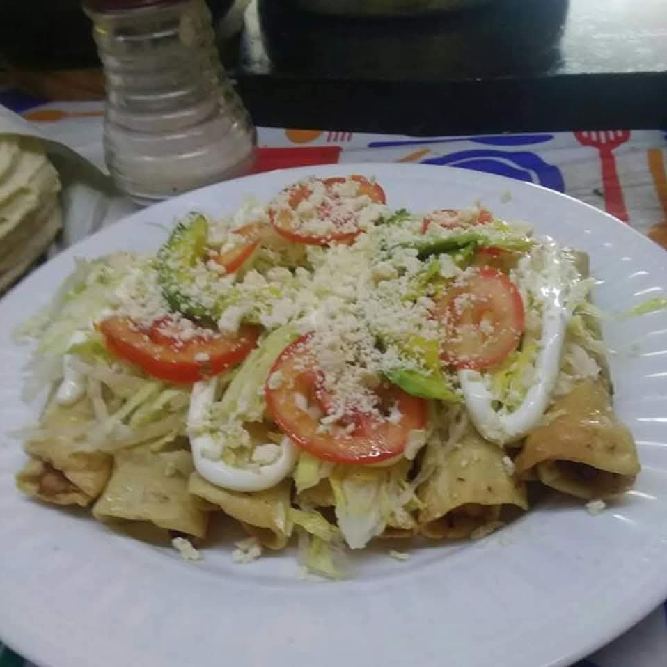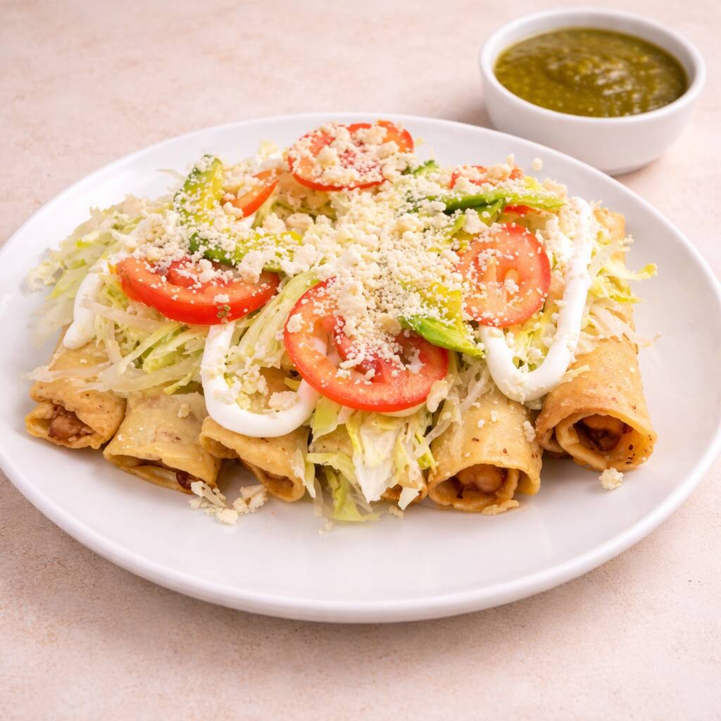 tacos dorados, rellenos de pollo ala mexicana, preparados con lechuga, tomate, crema, y queso