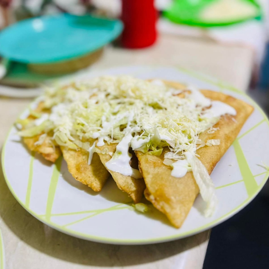 empanadas de maíz, rellenas de picadillo, preparadas con lechuga, crema, queso y salsa