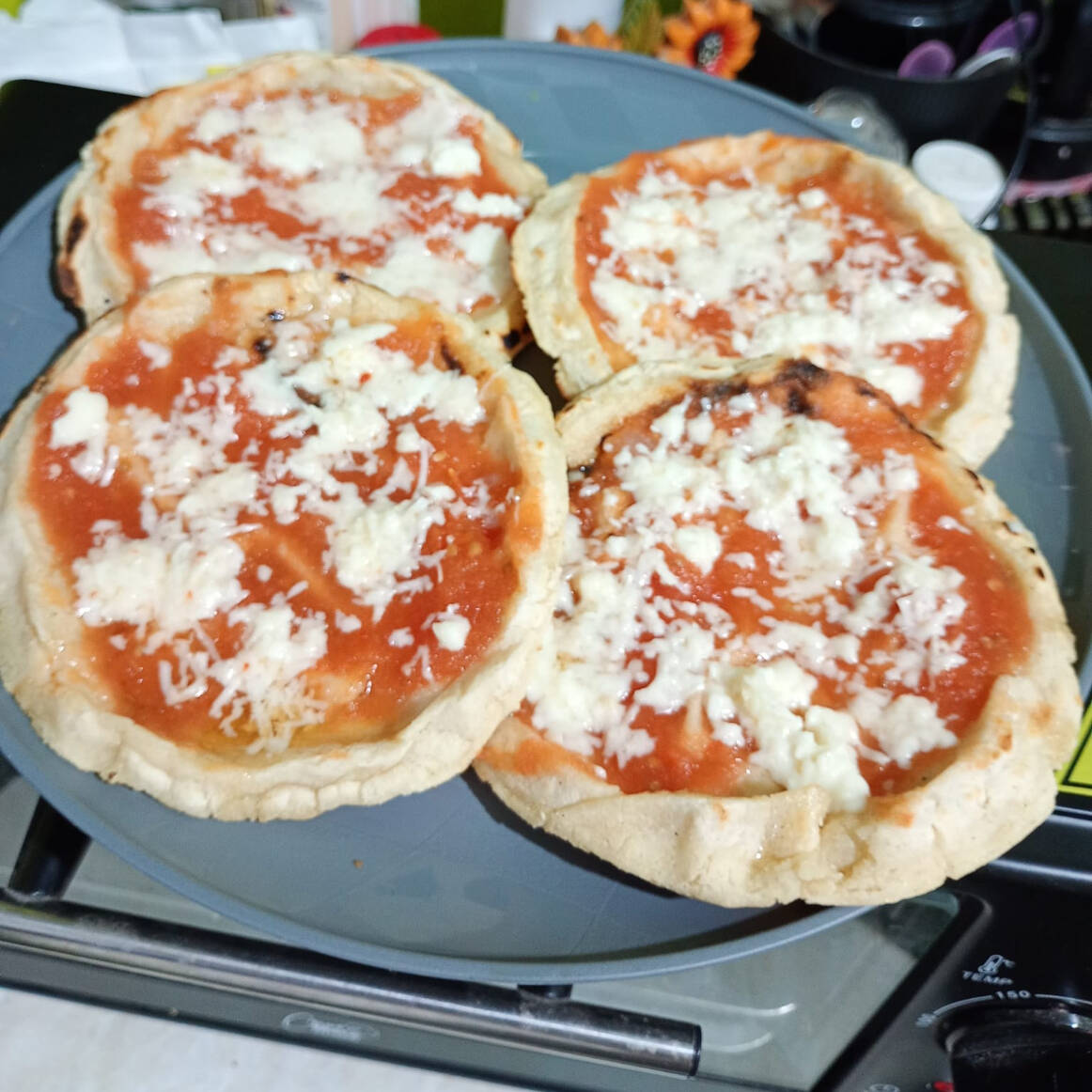 picaditas de maiz, bañadas por manteca, preparadas con salsa de tomate y queso