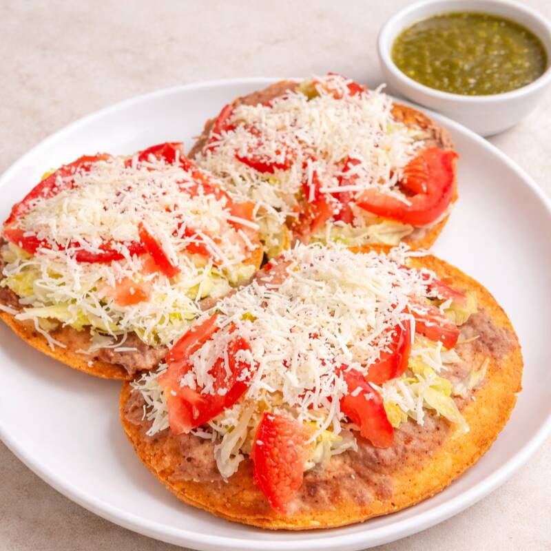 Empanadas de maiz, rellenas de chorizo con queso, preparadas con lechuga, crema, queso y salsa