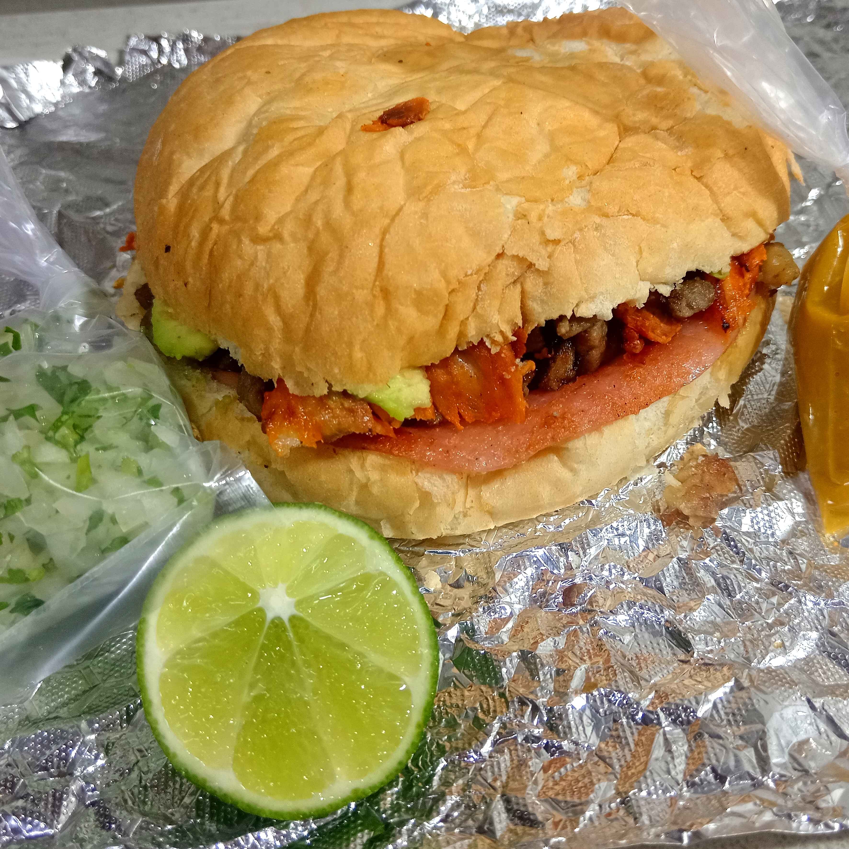 PAN, JAMÓN, QUESO DE HEBRA, AGUACATE, CARNE AL PASTOR, CARNE DE BISTEC DE RES, SALSA, VERDURA