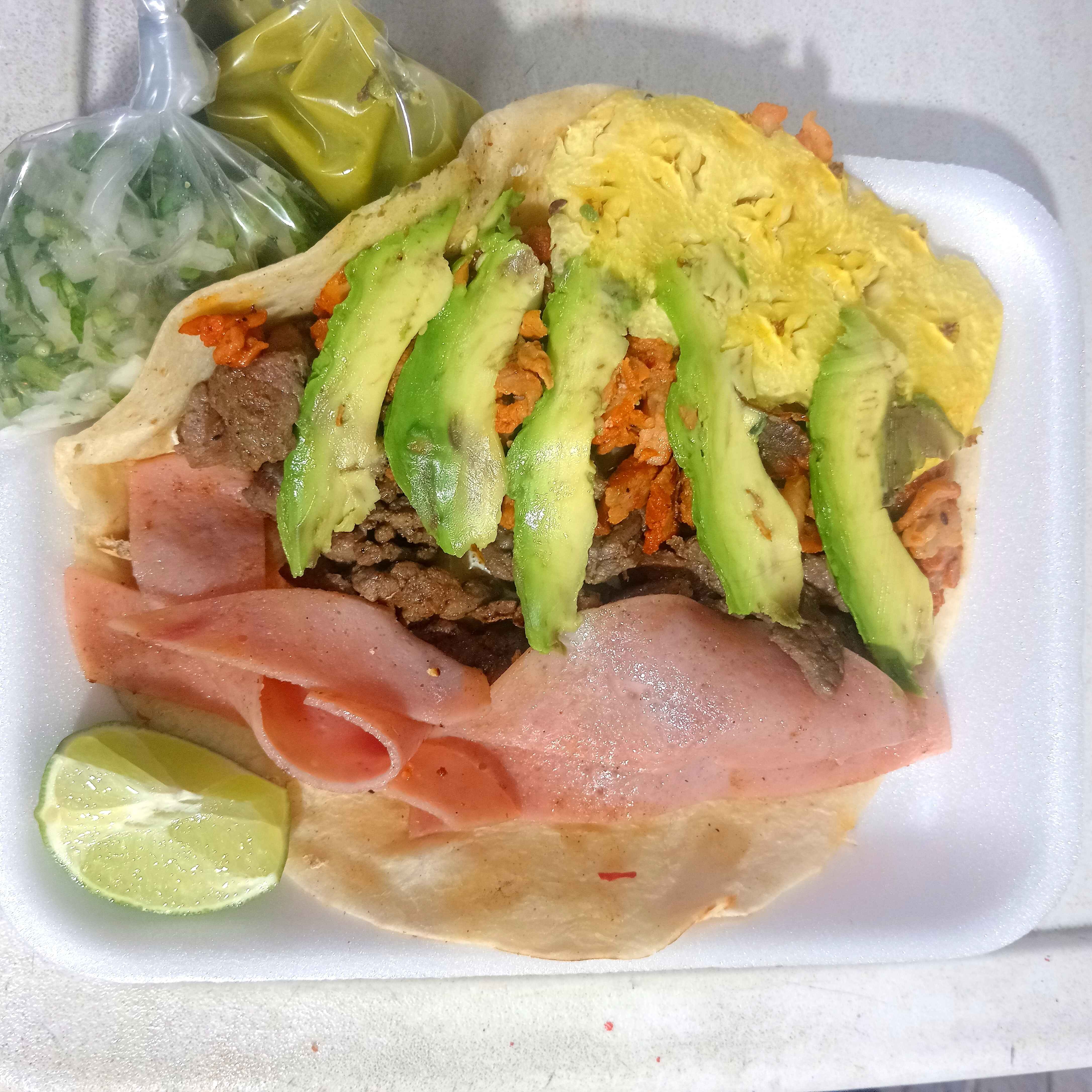PAN, JAMÓN, QUESO DE HEBRA, AGUACATE, CARNE AL PASTOR, SALSA , VERDURA