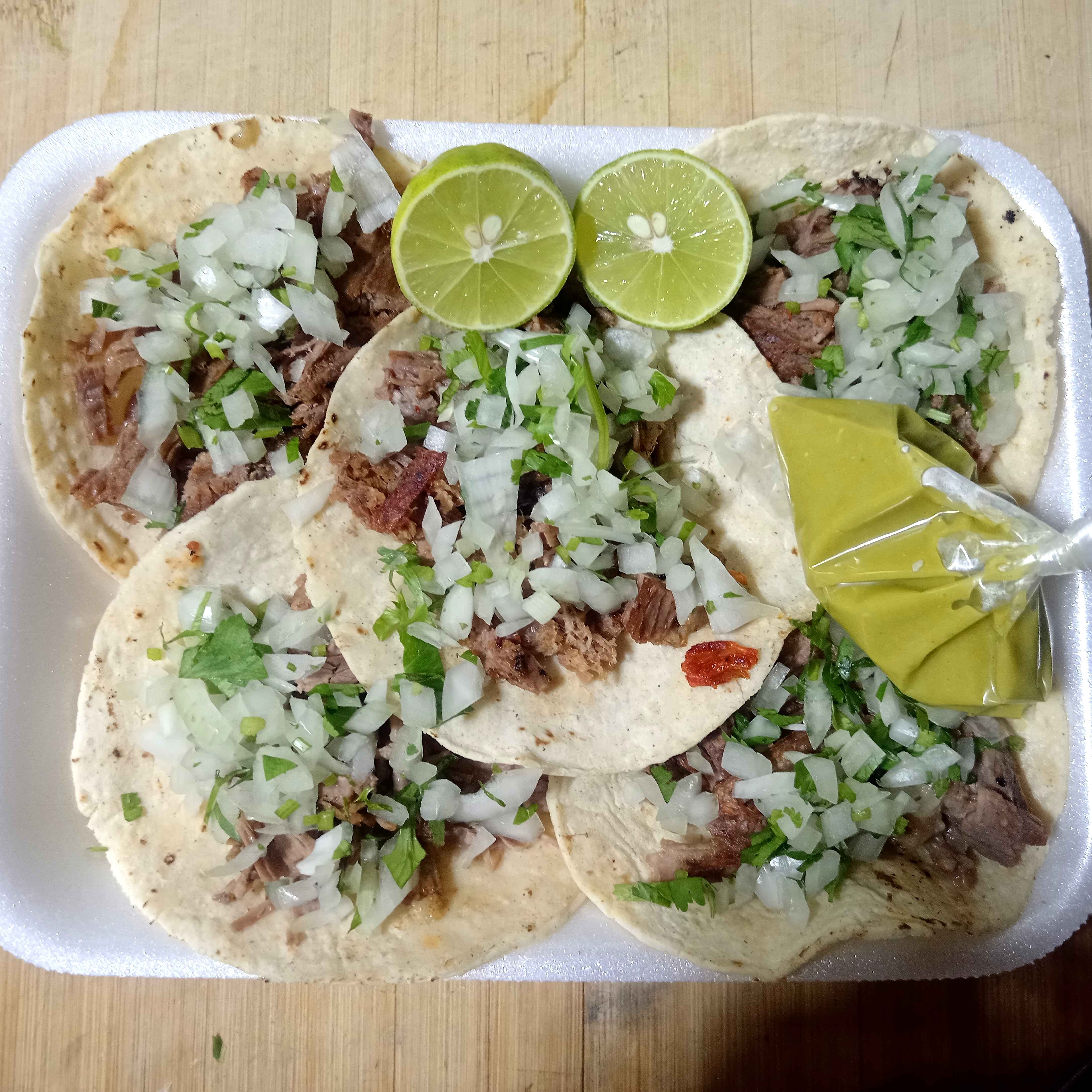 5 TACOS DOBLE TORTILLA, SALSA, VERDURA, PIÑA, LIMÓN