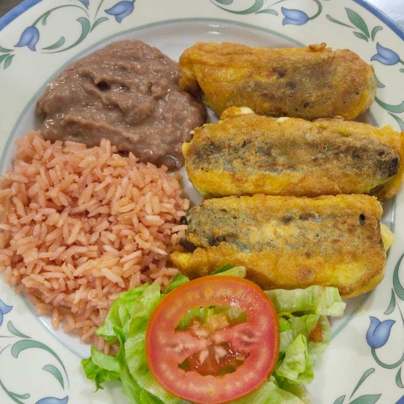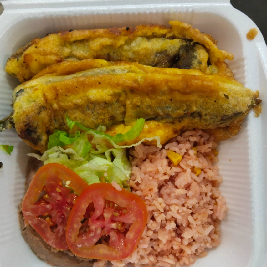 2 chiles rellenos, arroz, frijoles refritos, tortillas,ensalada