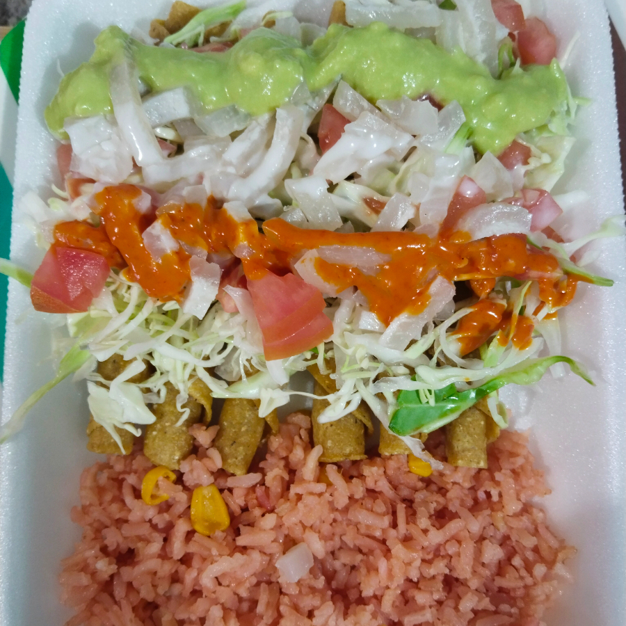 6 flautas caseras de carne, arroz, crema y guacamole, salsa roja y cueritos, repollo