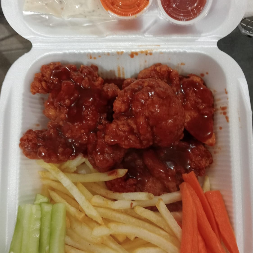 300gr. de Boneles bañados e Salsa Bufalo o Bbq, una oren de Papas Fritas, Aderezo Ranch, Capsup, Zanahoria, Pepino y Salsa Picante
