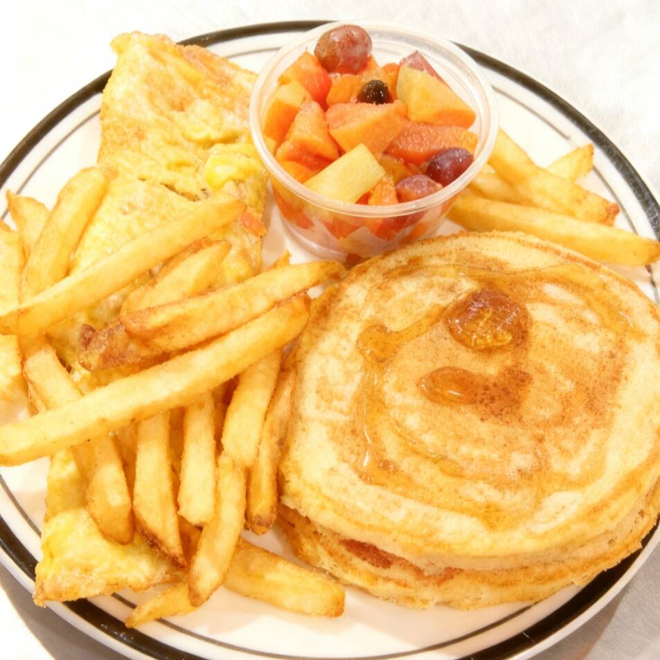 incluye :omelet de huveos con jamon y queso, 2 Hot cakes con porcionde miel, coctel de frutas, y porcion de papas a la fraancesa