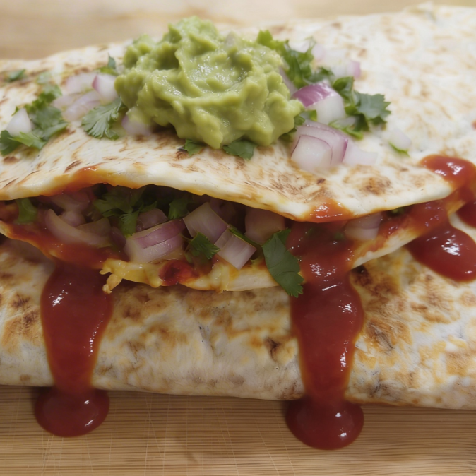 Quesadilla con carne adobada guacamole,cebolla, salsa y cilantro