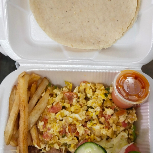 Desayuno huev os a la Mexicana incluye: porcion de frijoles;porcion de Papas, ensalada, salsa Y tortillas