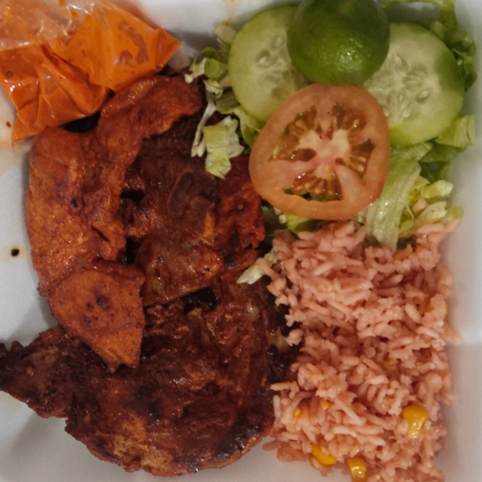 400gr de Chuleta de Cerdo Adobada, Incluye : Arroz, Ensalada de Lechuga,Salsa Picante
