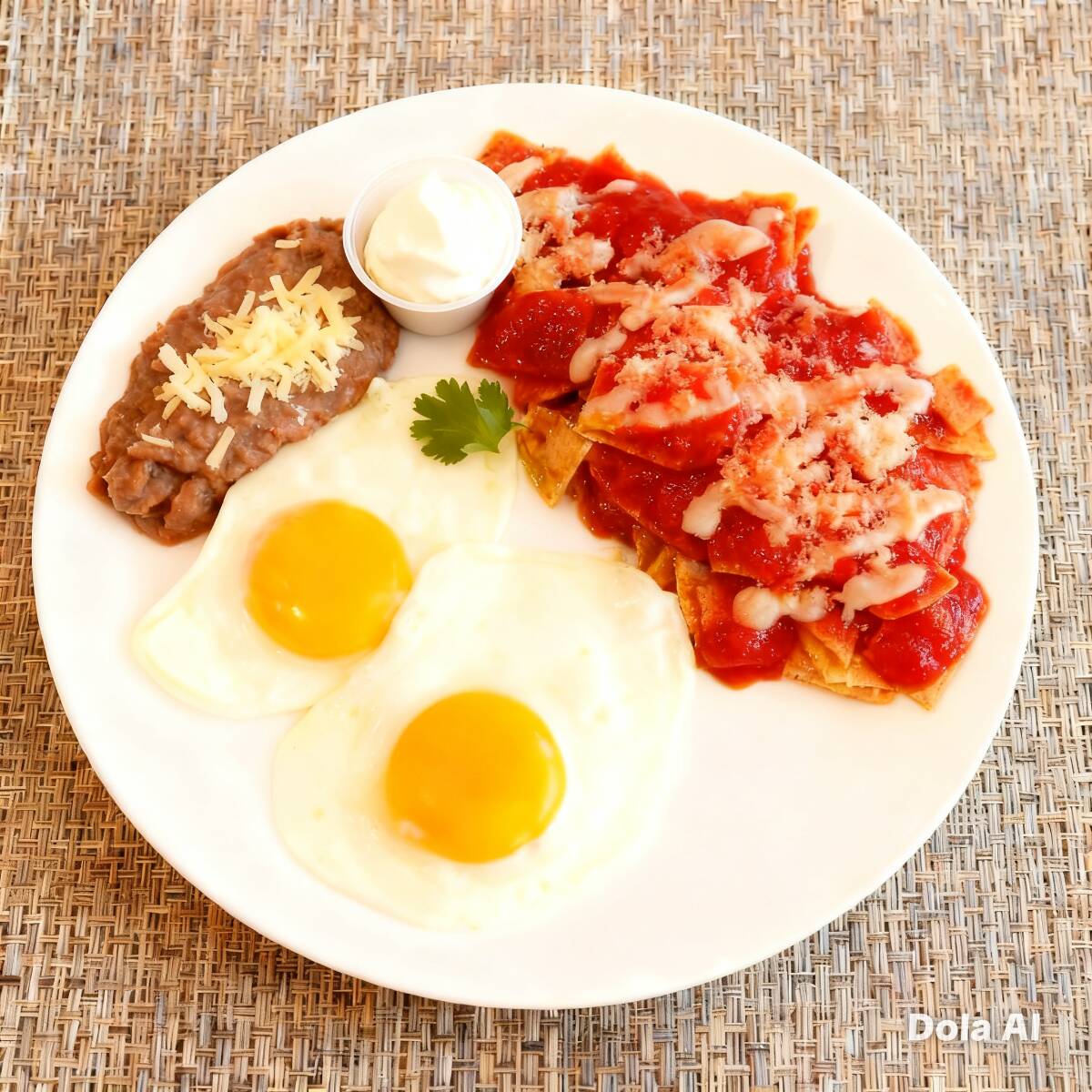 Chilaquiles en Salsa roja 2 huevo estrellados Frijoles con Queso y cporcion de Crema