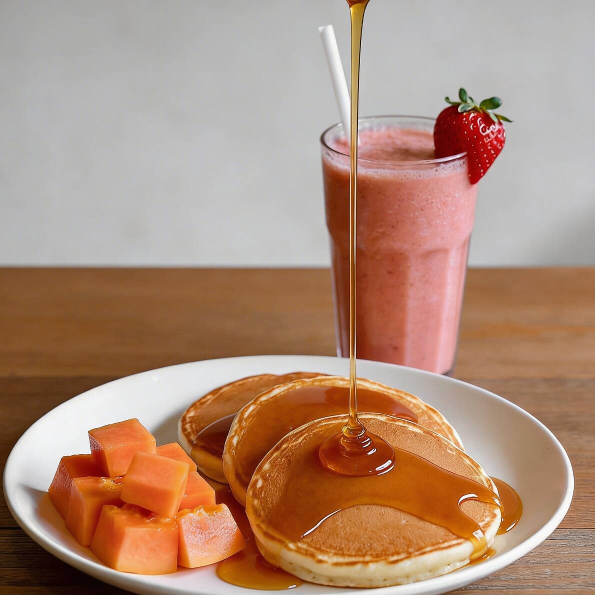 3 Hotcakes, fruta de temporada y licuado de fresa 500ml