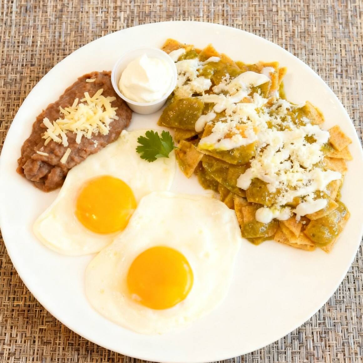 2 huevos estrellados, porcion de frijoles refrito con queso, porcion grande de chilaquiles bañados en sala verde queso y crema