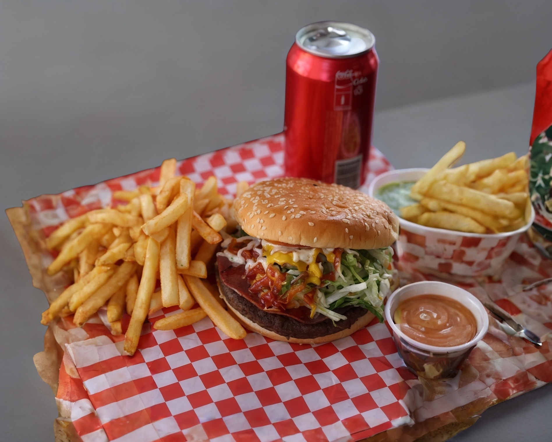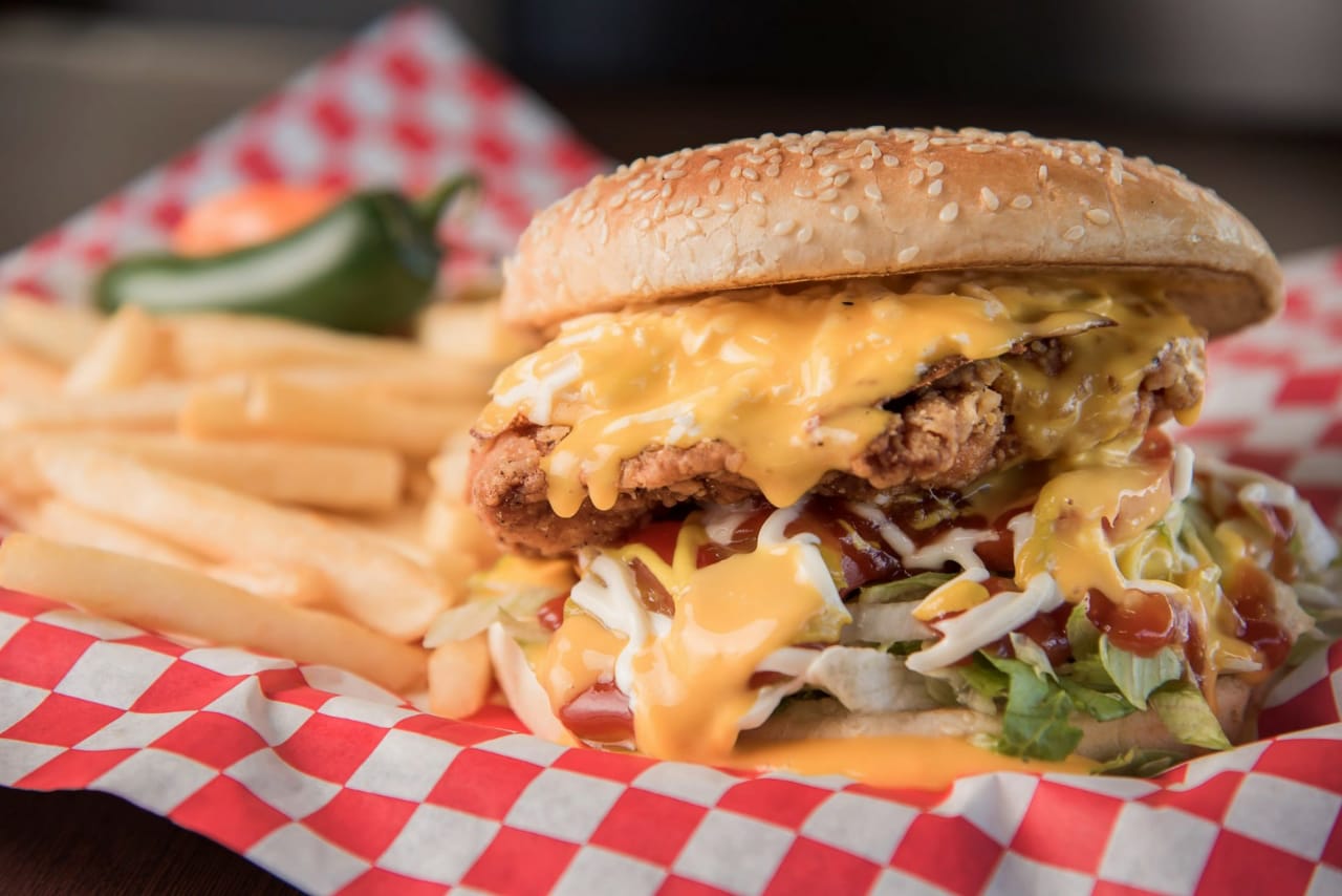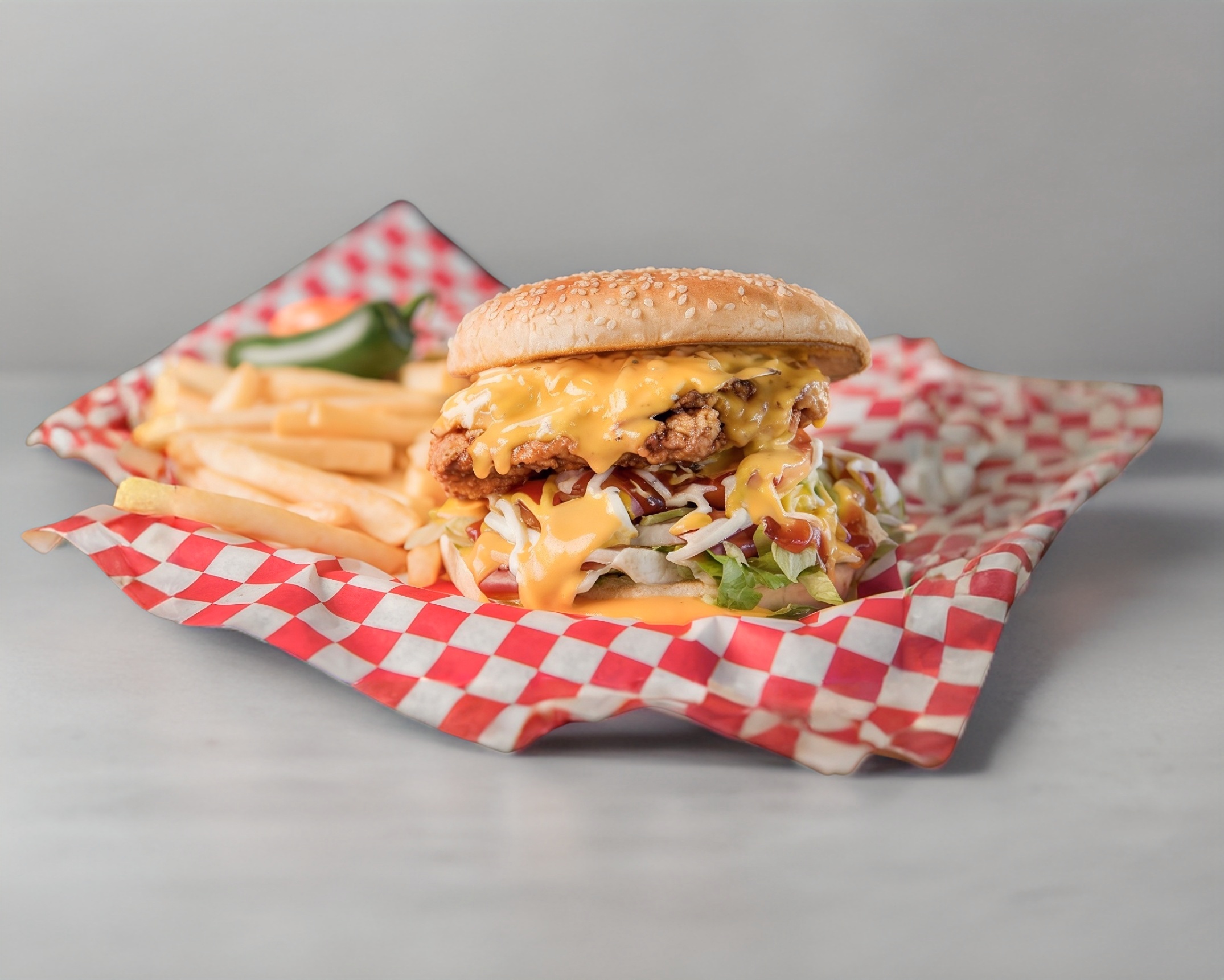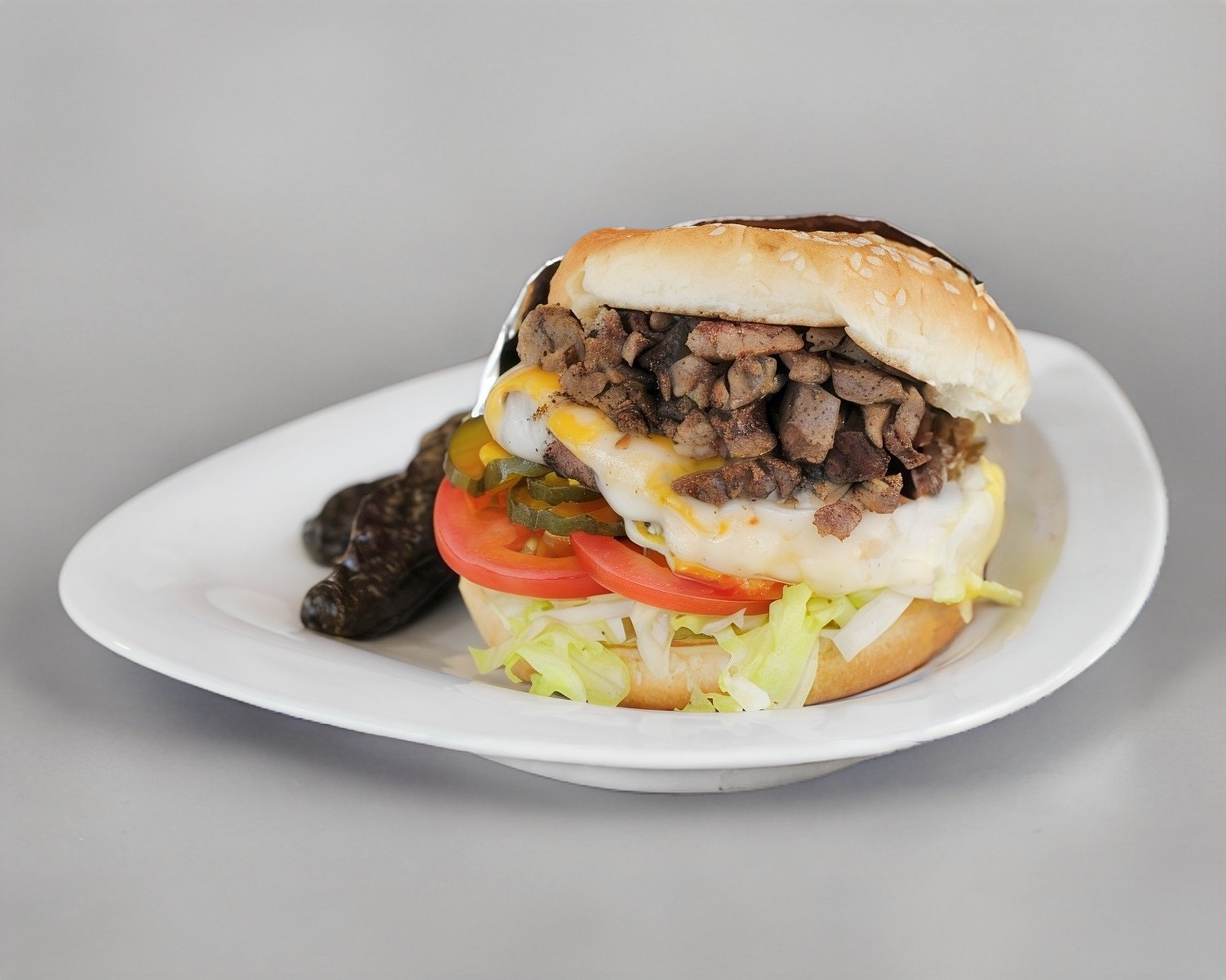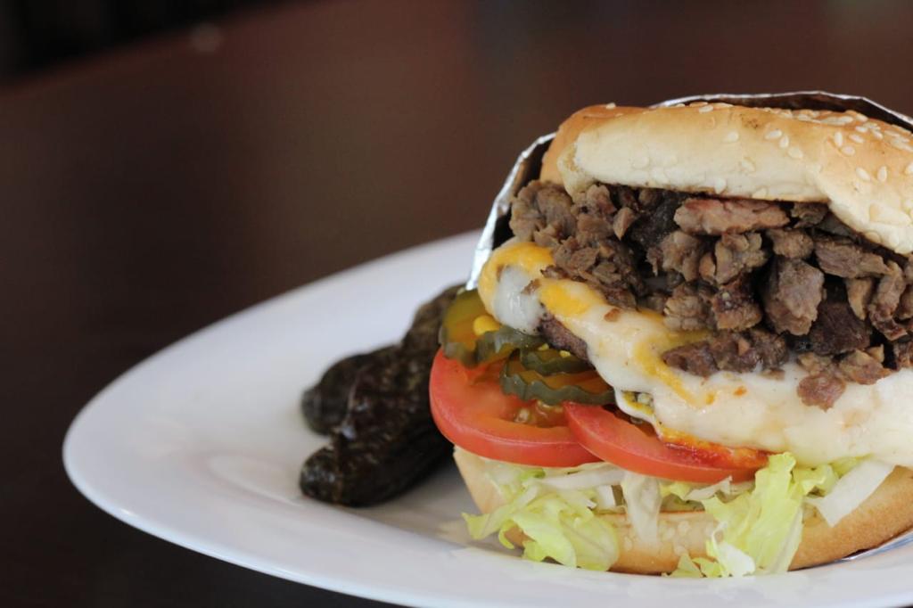 2 Carnesde sirloin, 2 quesos amarillos y queso manchego, acompañada de lechuga, tomate, pepinillos, mayonesa y mostaza.