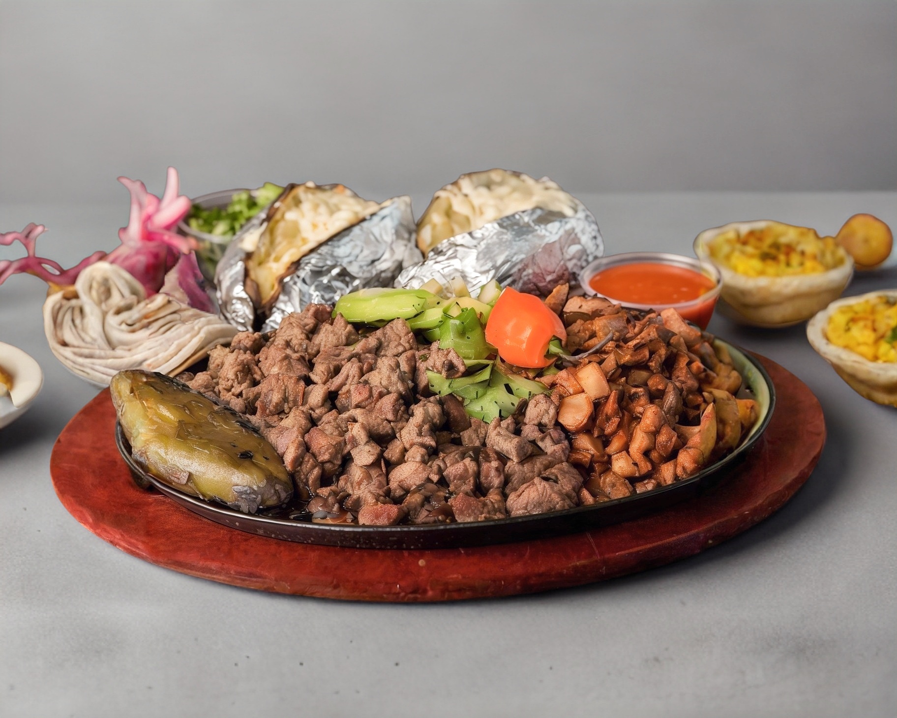 Sirloin a las brasas, mixto con carne al pastor bajadita del trompo y/o fajitas de pollo sazonadas con la receta de la casa. pide la combinacion como tu la prefieras. porcion para 5 o 6 personas