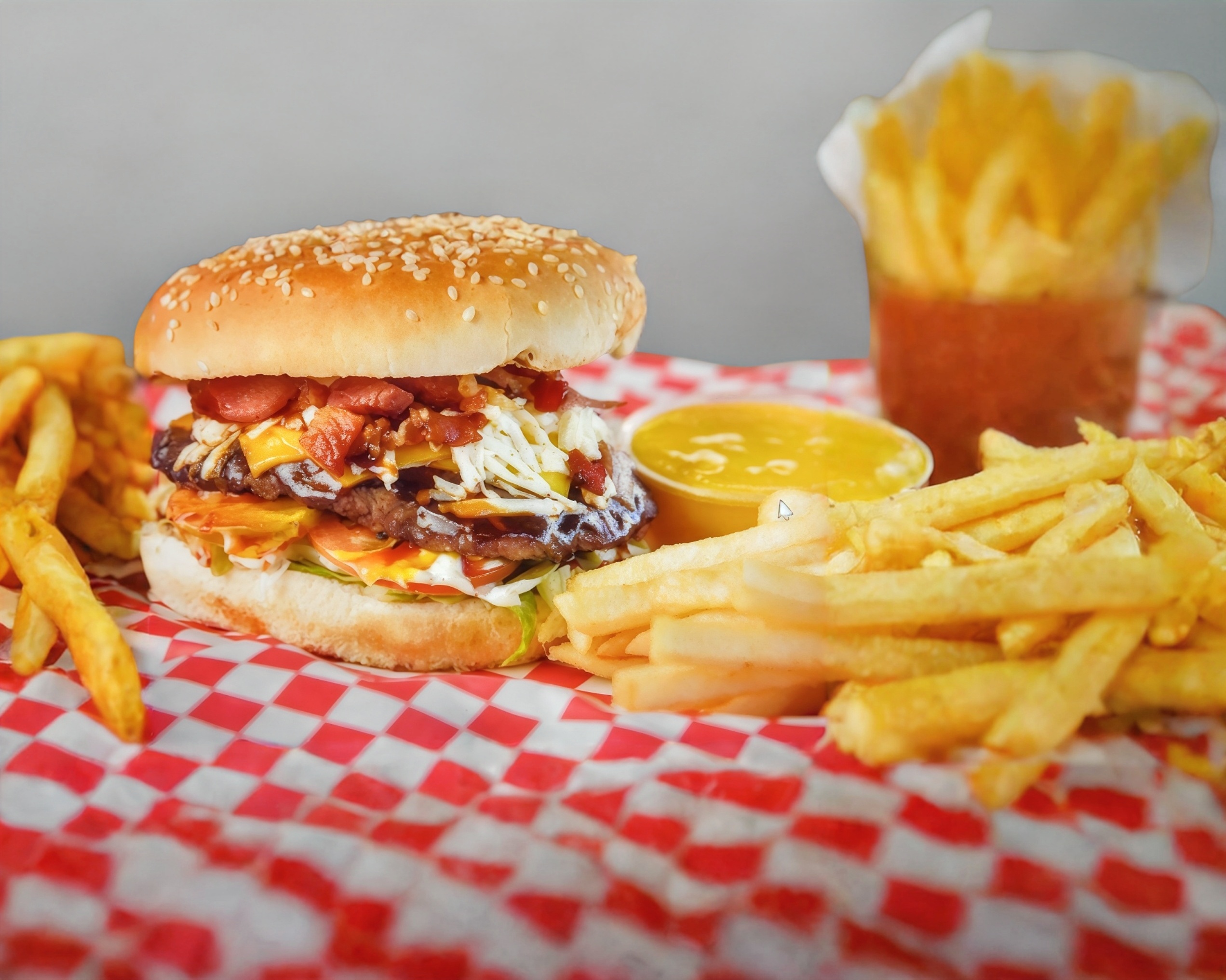 100% jugosa carne de res, queso americano, tocino y queso manchego. lecguga, tomate, pepinillo, mayonesa, catsup y mostaza.
