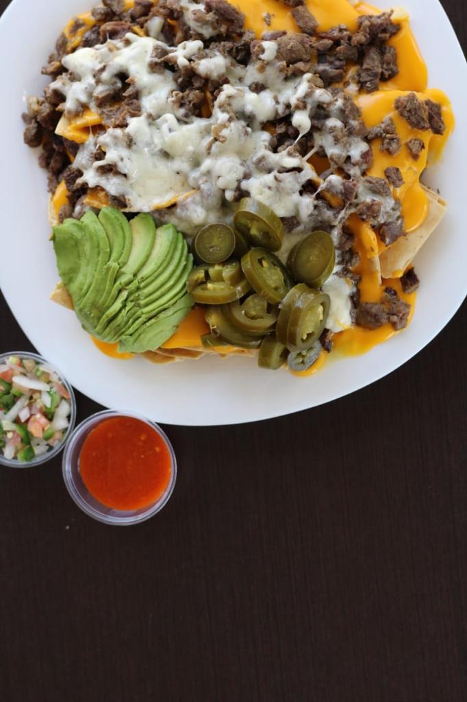 Deliciosos totopos baniados en queso amarillo con la carne de tu preferencia sirloin asado, pastor o alambre, con sus chilitos curtidos queso gratinado y rebanaditas de aguacate fresco, tienes que probarlos, porción grande.