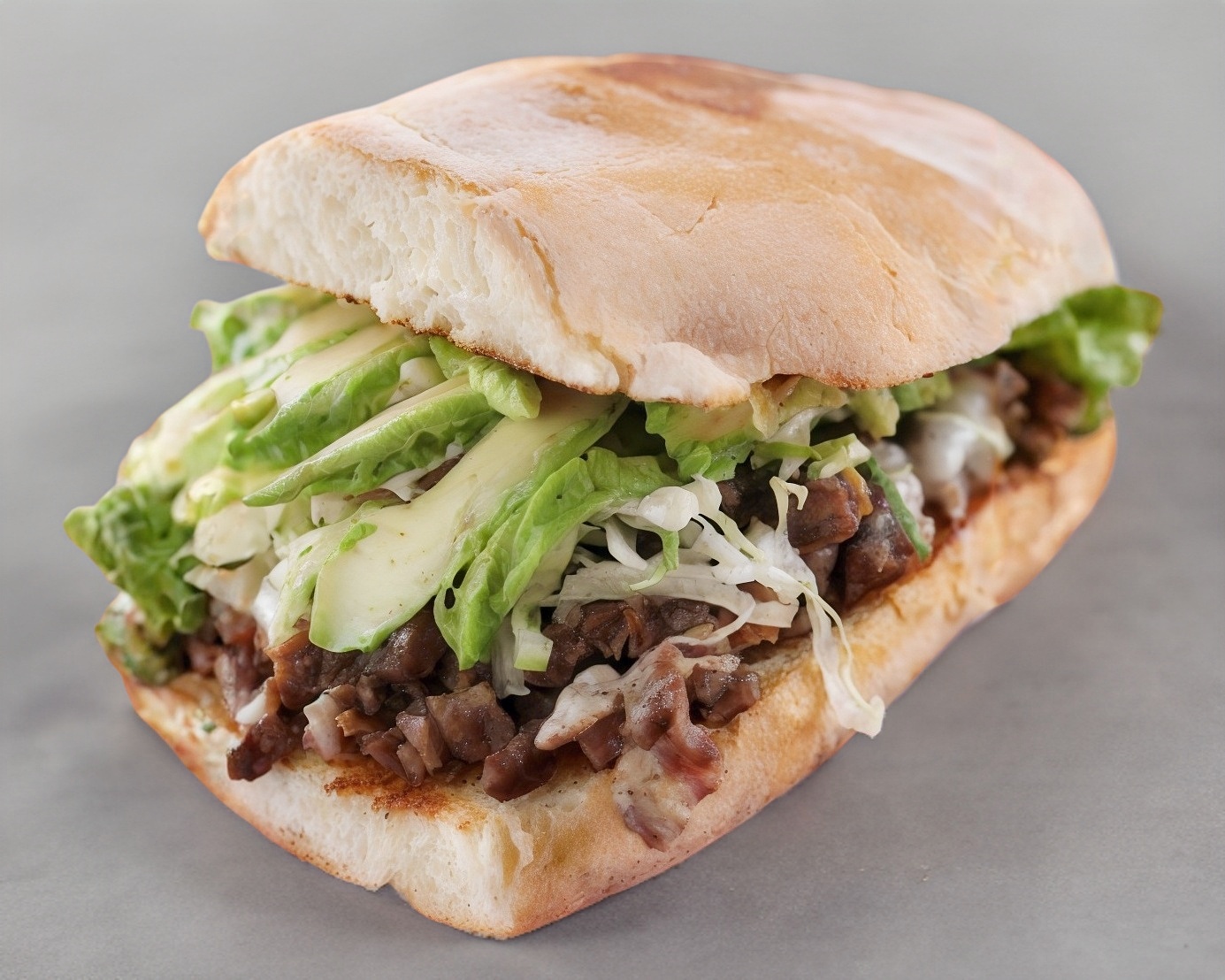 100 % jugosa carne de Sirloin, jamón y queso americano amarillo, lecguga, tomate, pepinillo, mayonesa, catsup, y mostaza.