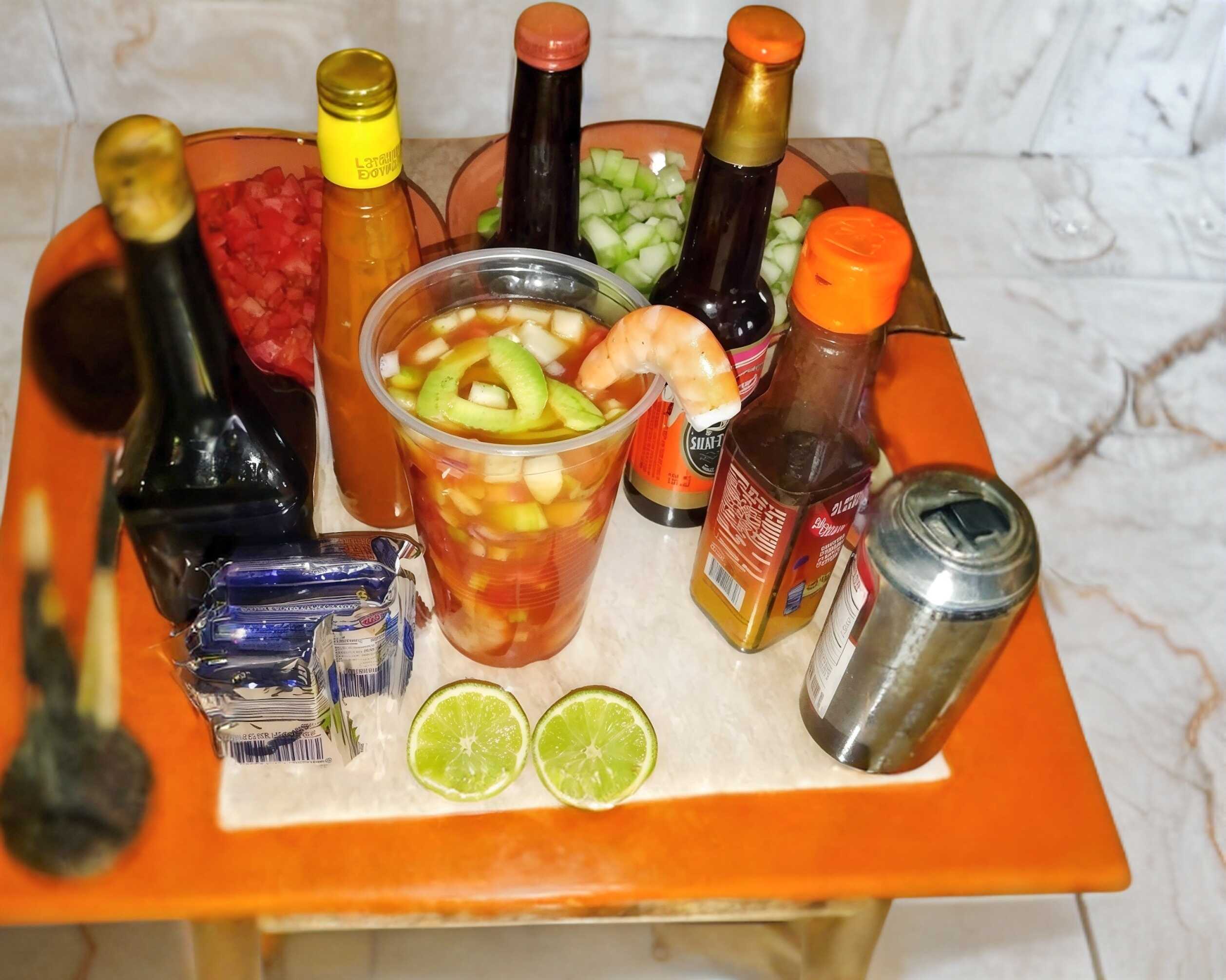 Clamato preparado salsa especial de la casa, salsas, especies, apio, carne seca, camarón fresco y suculentos ostiones recién sacados de su concha.