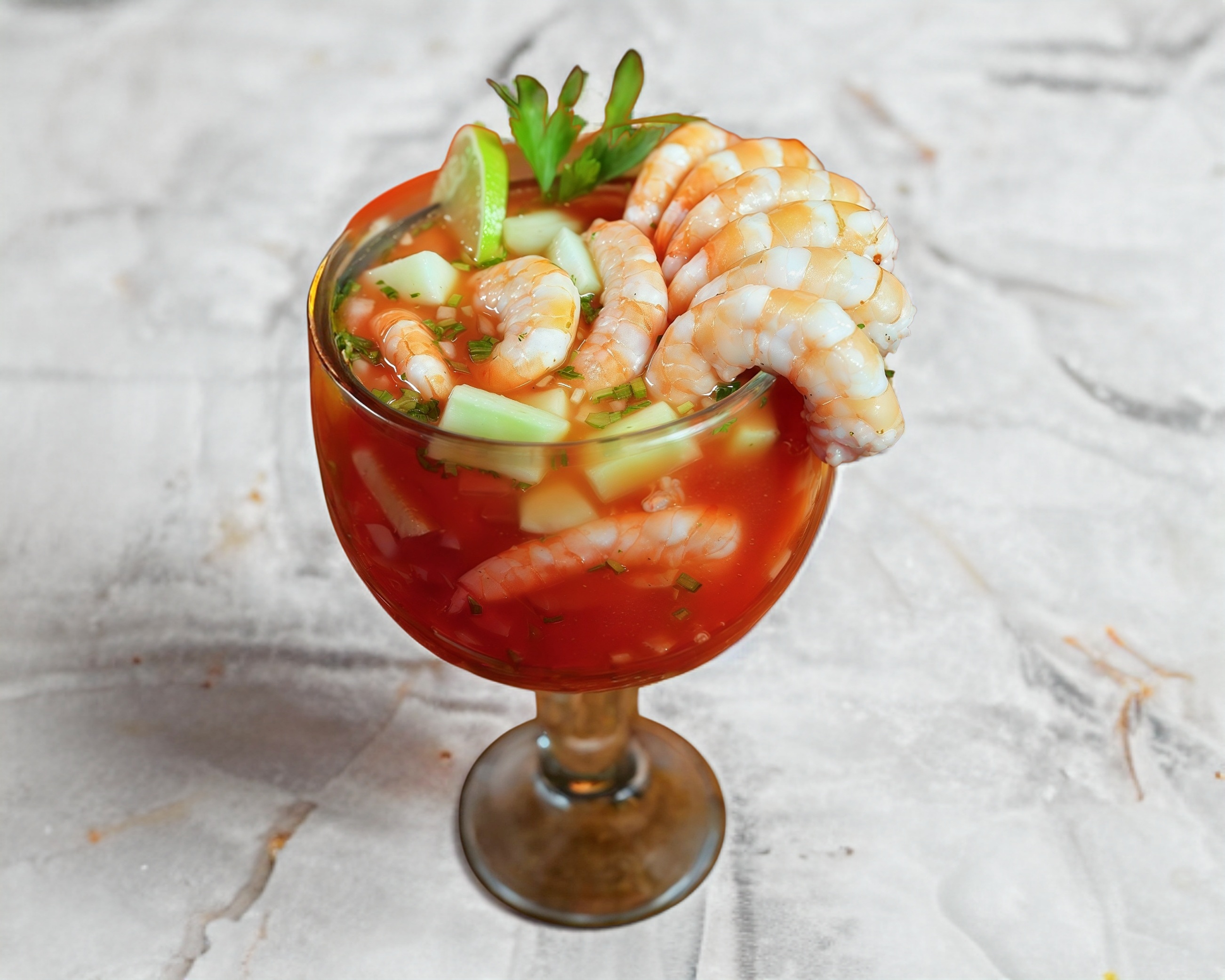 Camarones cosidos acompañados de pepino, aguacate, tomate, cebolla, cilantro en jugo de coctel especial de la casa