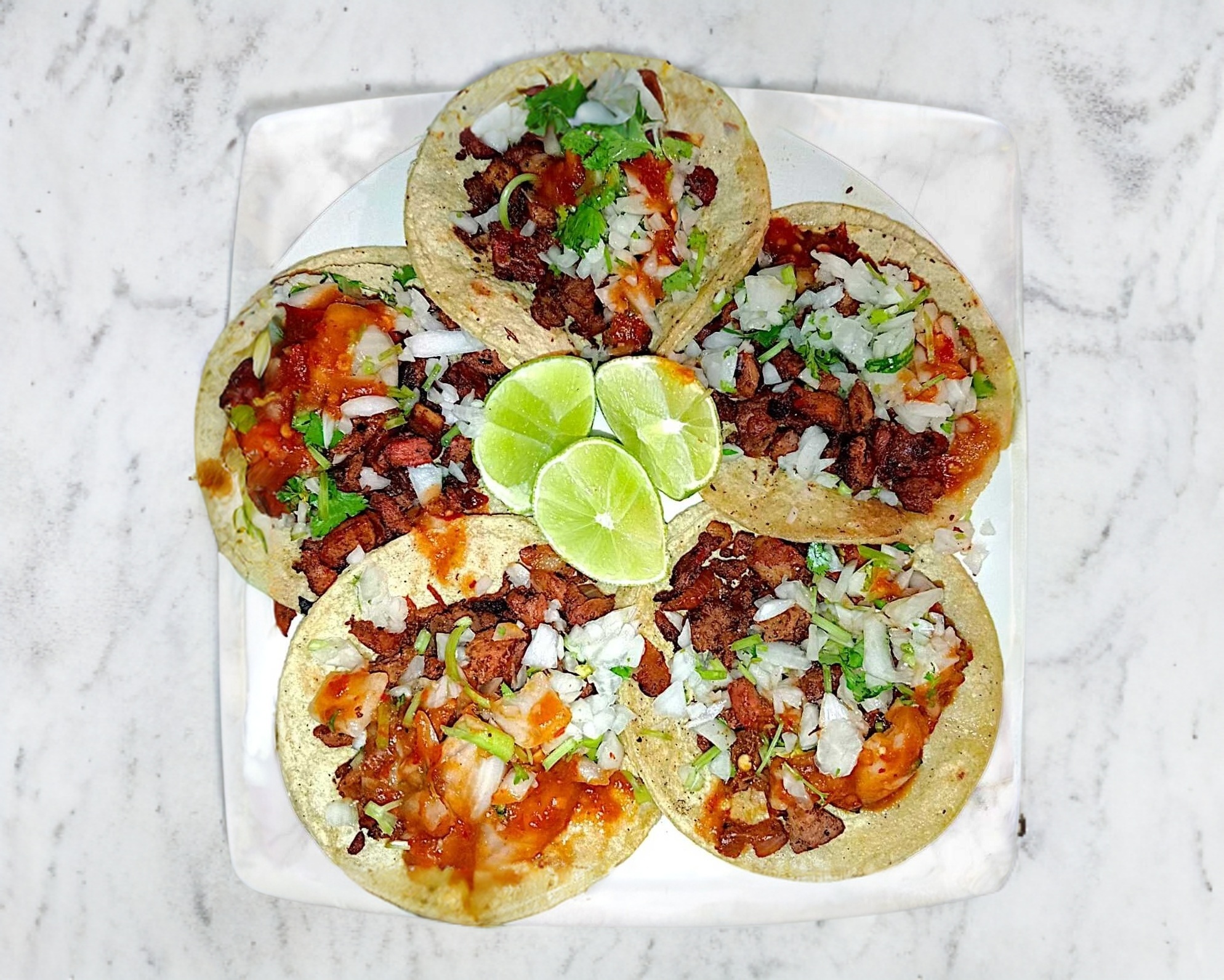 Salsa roja, limones, cebolla con cilantro y la orden trae 5 tacos con tortilla doble