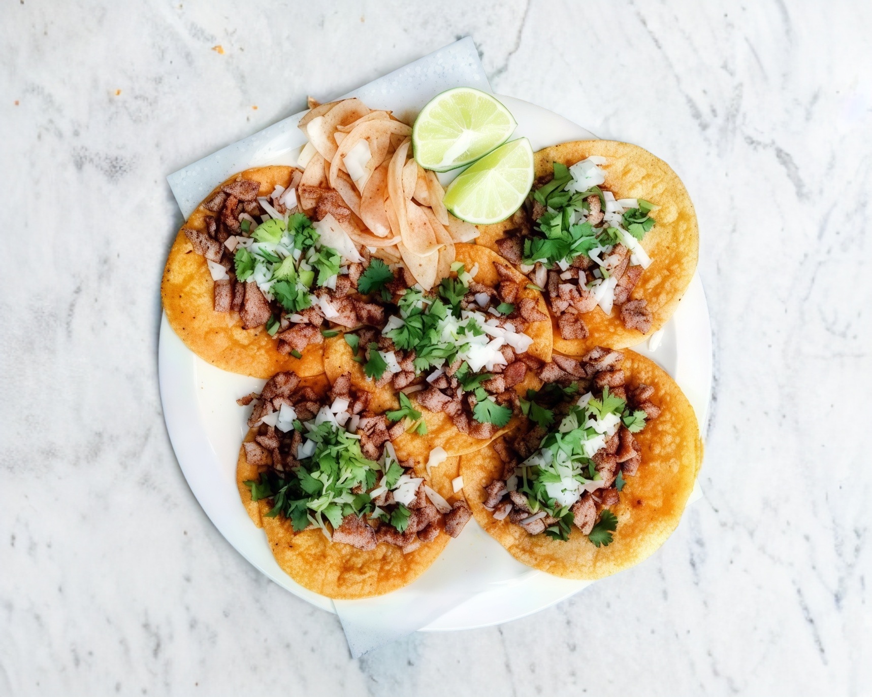 Salsa roja, limones, cebolla con cilantro, orden con 5 tortillas dobles