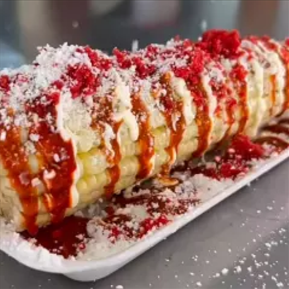 Elote entero tradicional, mantequilla, queso, crema y mayonesa.