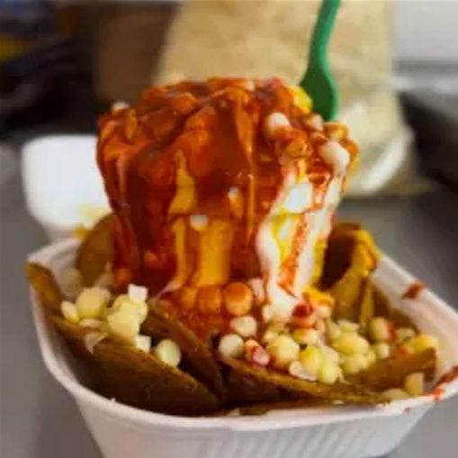 Elote en vaso con mantequilla 3 quesos mayonesa crema y papitas de tu elección.