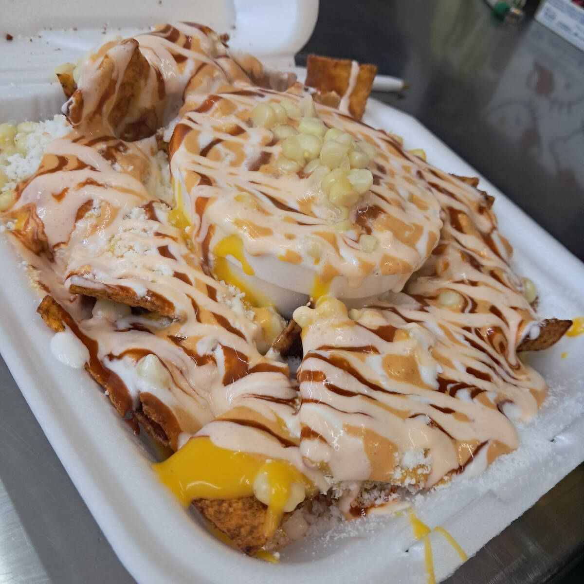 Papitas de tu elección, bañadas en queso con elote, nuestras salsas y más queso.