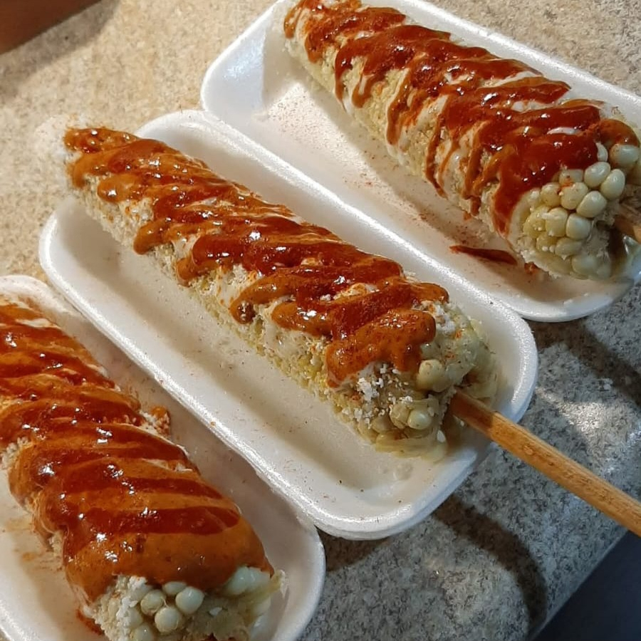 Elote entero con mantequilla, queso, mantequilla, valentina y nuestras riquísimas cremas naturales.