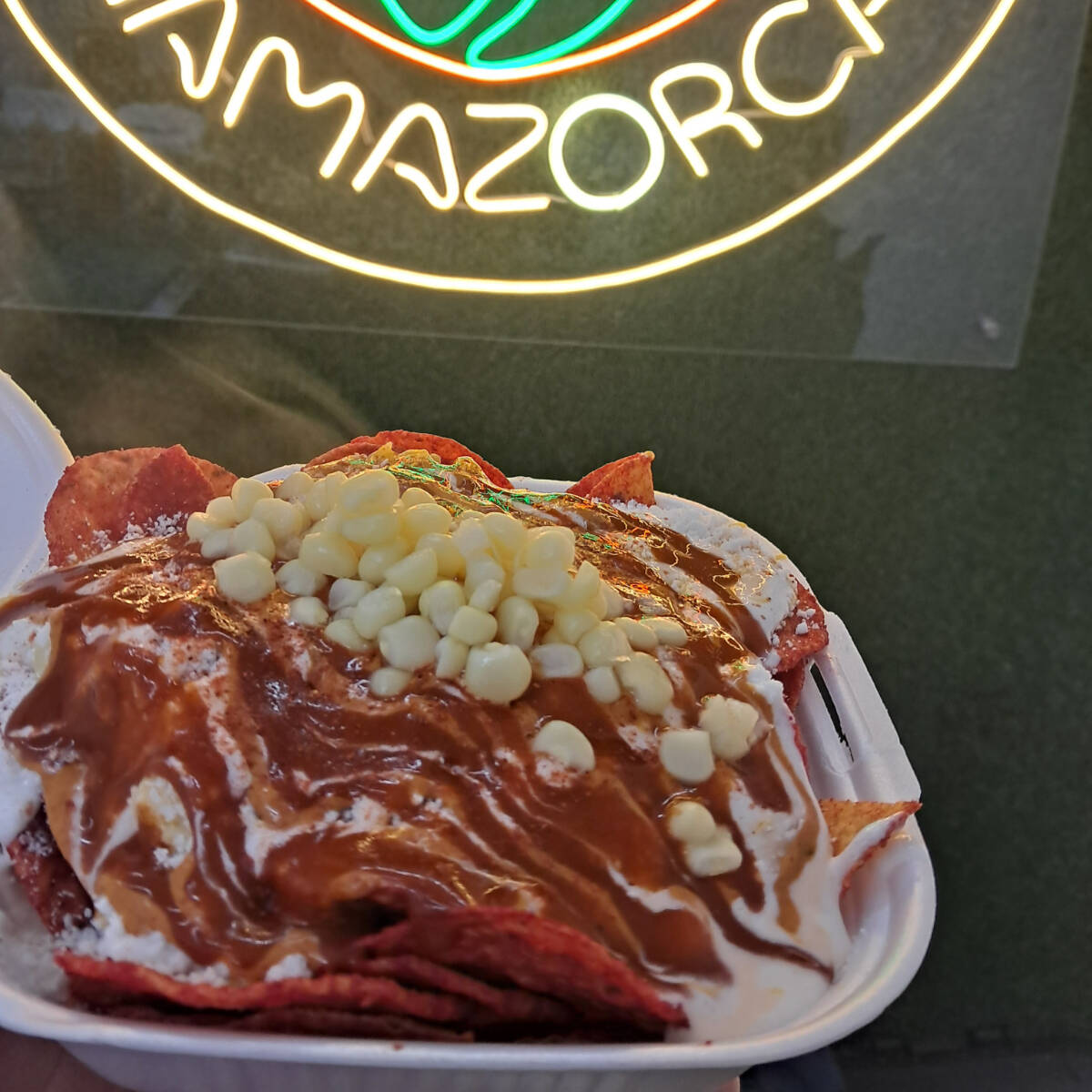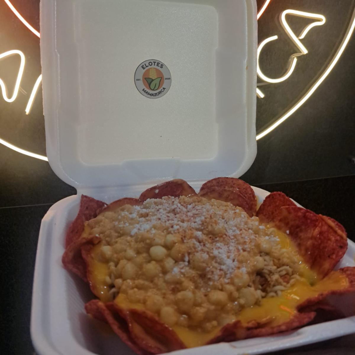 Deliciosa sopa maruchan, bañada en queso, nuestras salsas con elote, en una cama de papitas a elegir con queso amarillo Y MÁS ELOTE
