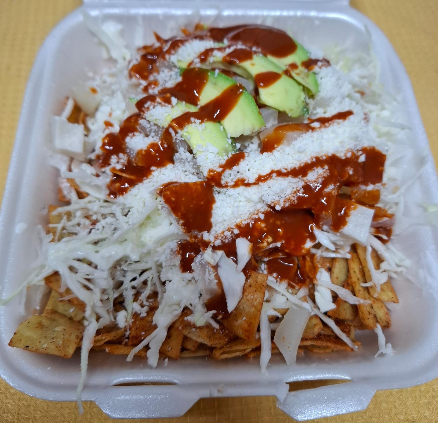 Fritura, repollo, cueritos, queso en polvo, crema, tomate, aguacate y salsas.