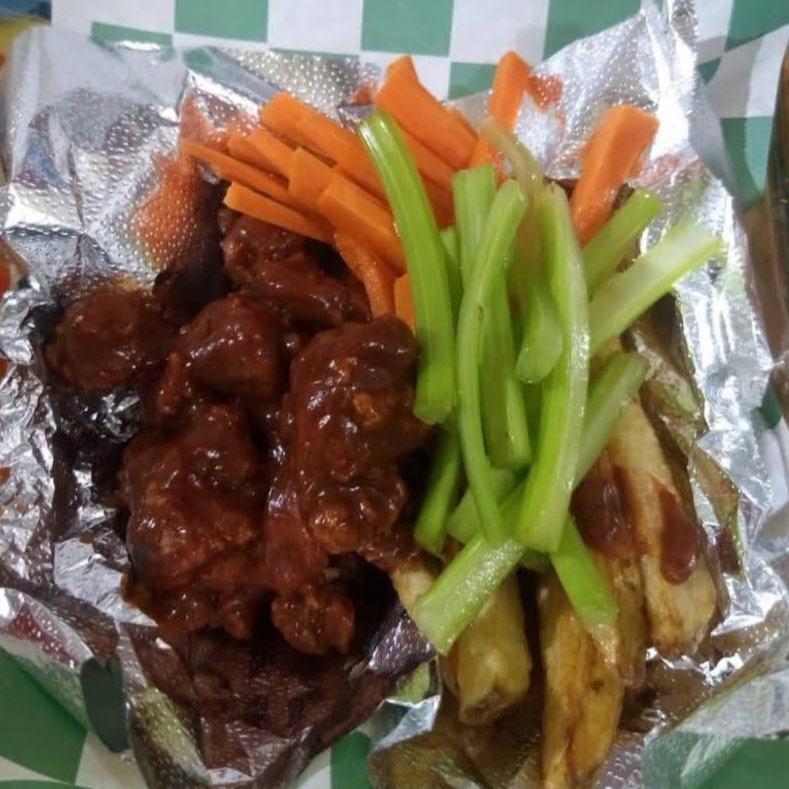 300grs de alitas sabor BBQ, ranch, catsup, zanahoria, apio,porcion de papas fritas
