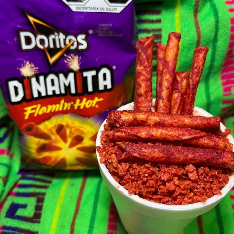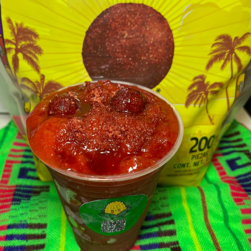 Vaso de elote en grano de 8 onzas,con matequilla,limon,queso crema,sabritas dinamita flamin hot