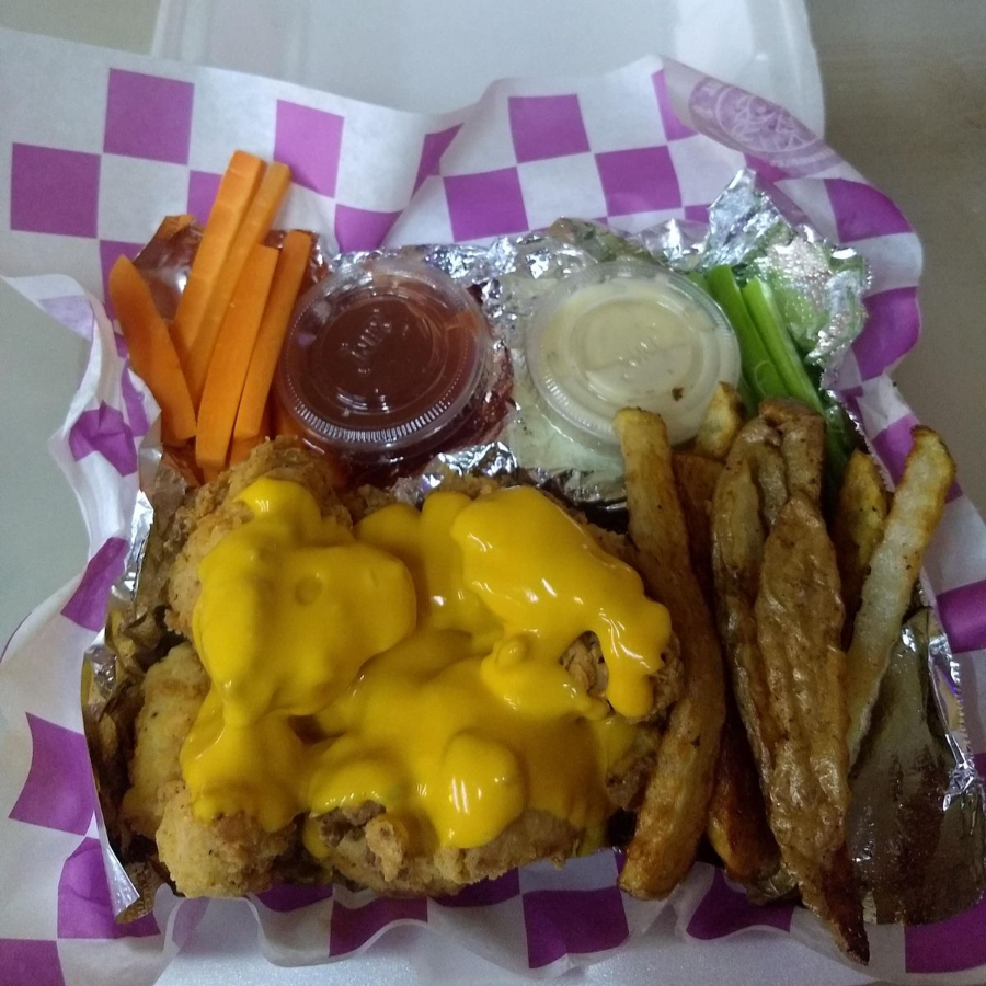 300grs de pechuga de pollo, con aderezo sabor mango habanero,ranch, catsup, zanahoria, apio, porcion de papas fritas