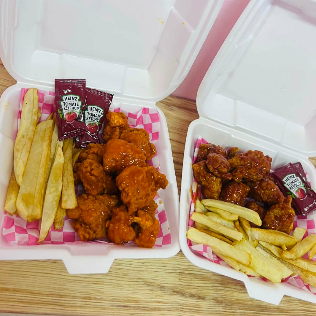 300 gramos de boneless en salsa a tu eleccion con papas fritas