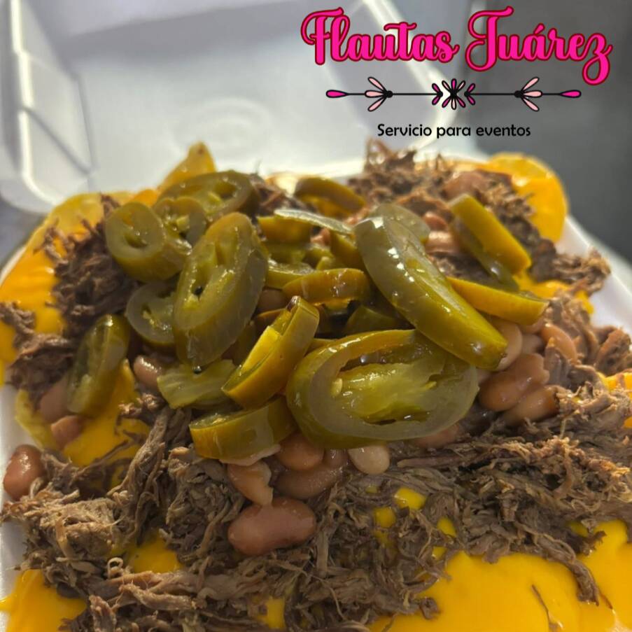 Hechos con totopos de maiz, con carne deshebrada, queso cheddar y chiles curtidos