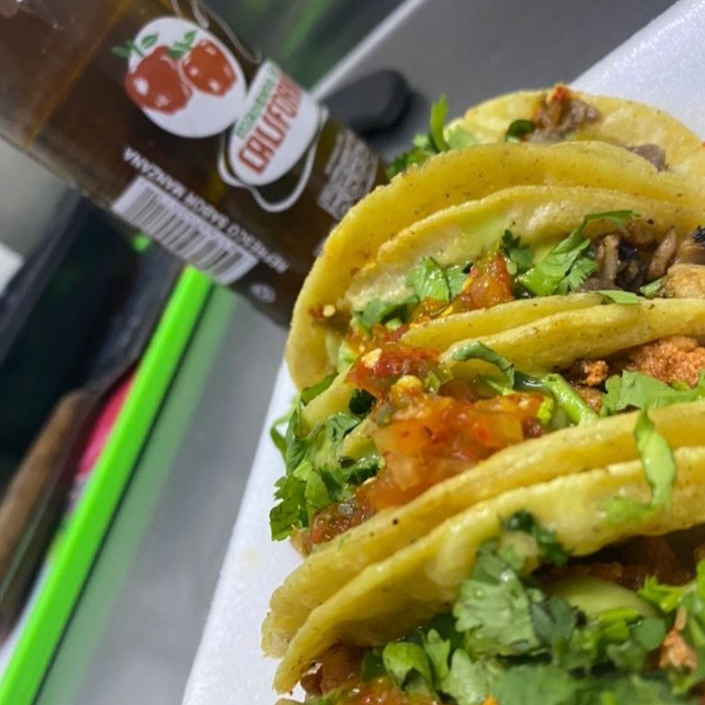 Orden Tacos Chorizo (4 Tacos). Incluye: limones, salsa, cebolla, cilantro, guacamole.