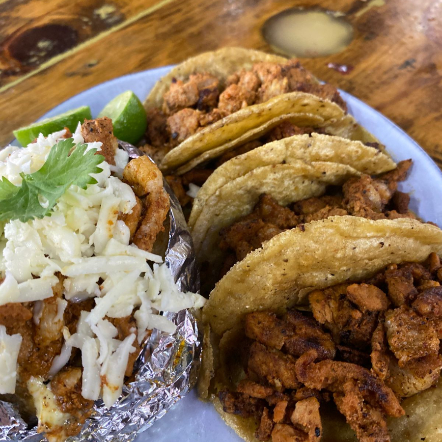 Orden Tacos Buche (4 Tacos). Incluye: limones, salsa, cebolla, cilantro, guacamole.