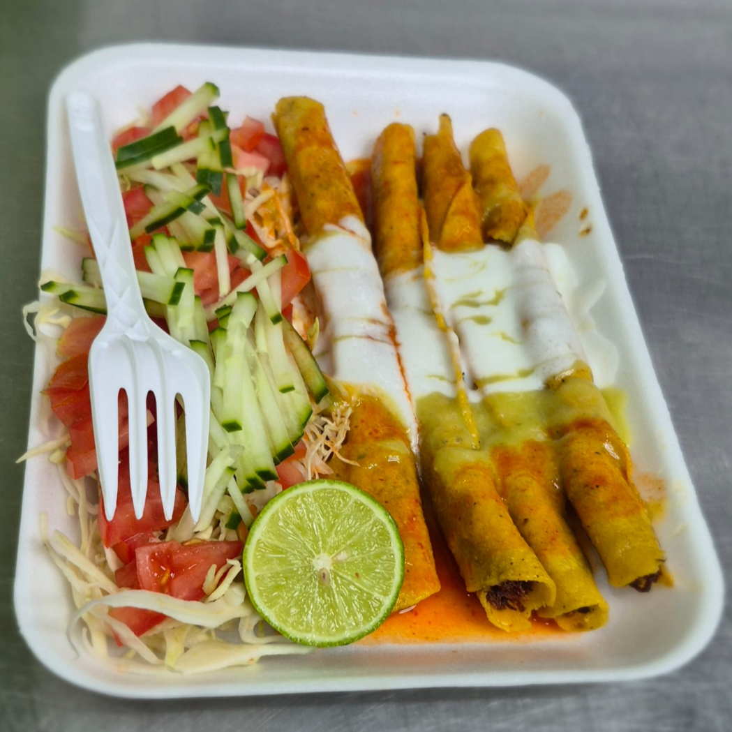 Repollo, zanahoria y pepino rallado, tomate, limón, guacamole y salsa verde o roja