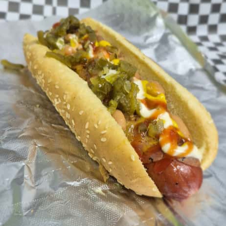 Salchicha para asar, Queso, lechuga, tomate, catsup, mayonesa, mostaza, chiles Toreados