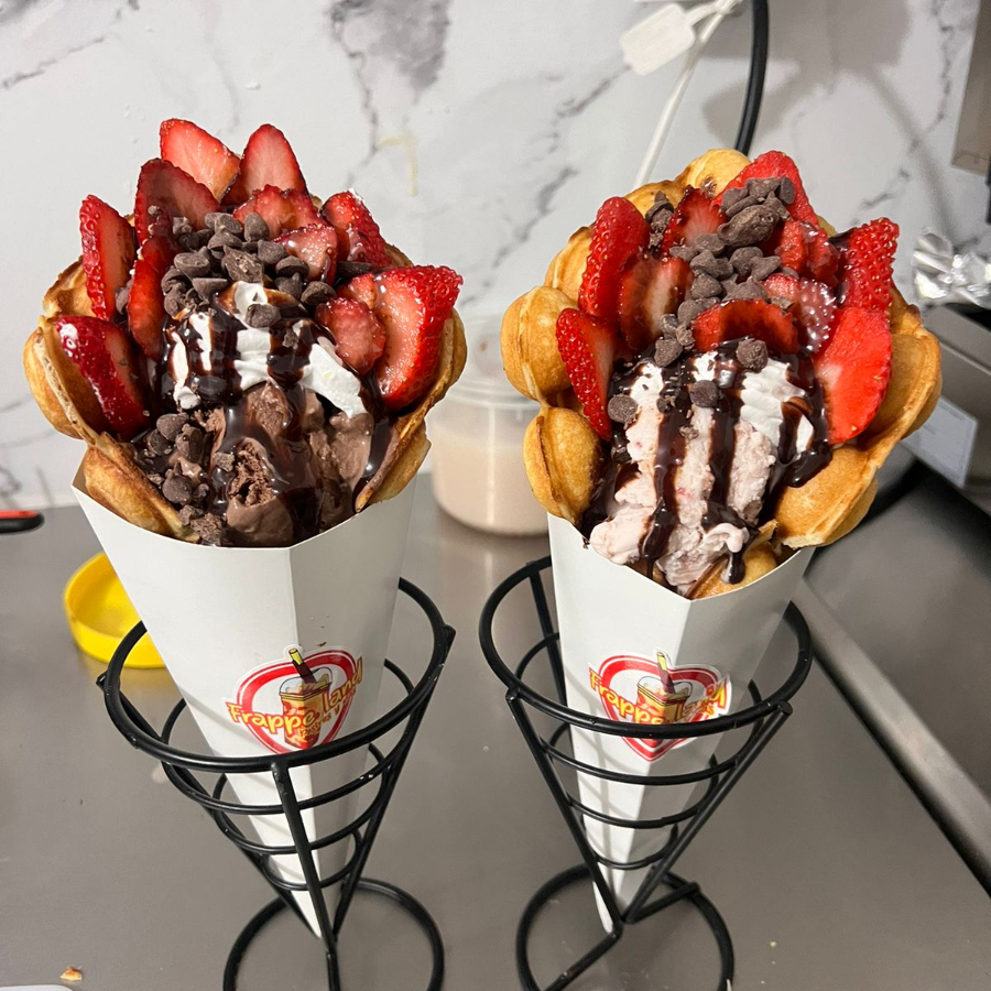 WAFFLE BURBUJA CON JARABE, NIEVE Y TOPING